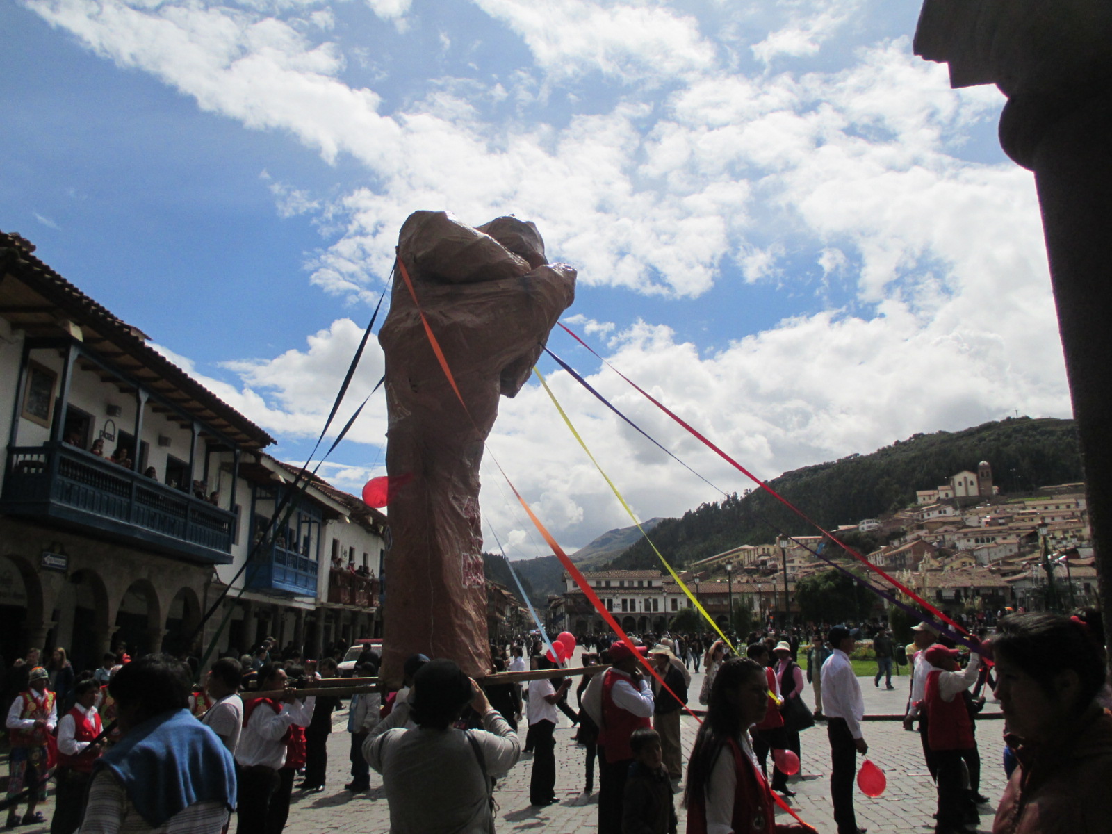 The flag of Cusco on the left is almost the same as what we recognize as the gay pride flag (Cusco flag has that seventh light blue stripe) and causes a lot of visiting gringos to inquire about it. Cusco was the center of the Inca empire at one time before the Spanish came and a feature of Inca emblems and banners was the rainbow usually arching between the mouths of various animals. The rainbow is now an echo from the past and a symbol of Cusco’s proud heritage.